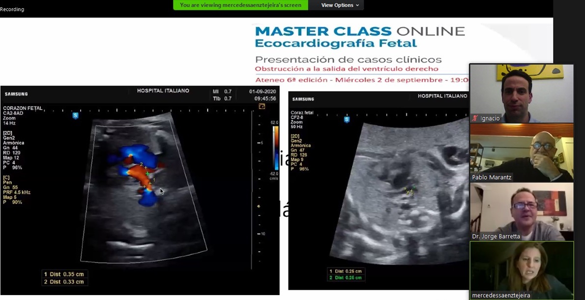 Ante un muy buen nivel de concurrencia, el pasado 2 de septiembre se realizó vía Zoom una nueva Master Class Online de Ecocardiografía Fetal, a cargo del Dr. Pablo Marantz, Director Médico de Fundación Hospitalaria; y las Dras. Mercedes Sáenz Tejeira, Jefa de Cardiología; y Sofía Grinenco, integrante del servicio de Cardiología Fetal.